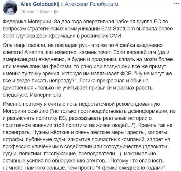 "Ольгинцы пахали, не покладая рук - это же по 4 фейка ежедневно клепать! А капля, как известно, камень точит. Если европейцам ежедневно, в будни и праздники, капать на мозги более или менее явными фейками, то рано или поздно они все же примут именно ту точку зрения, которую им навязывает ФСБ", - предупредил Голобуцкий, уточнив, что предложенными Могерини методами Кремль одолеть не удастся.