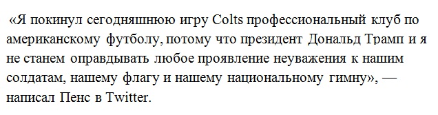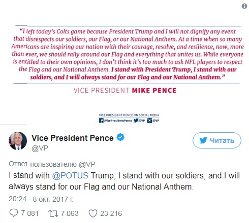 Вице-президент Соединенных Штатов Америки Майк Пенс, покинув один из матчей Национальной футбольной лиги, заявил, что ни он, ни хозяин Белого дома Дональд Трамп не будут терпеть пренебрежительное отношение к национальной символике государства.