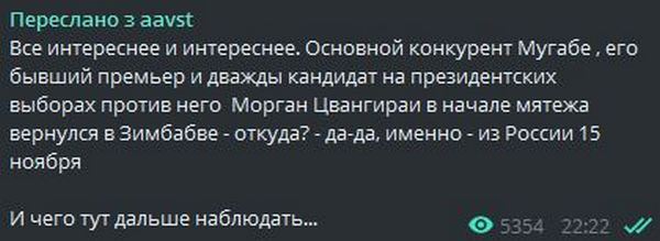 Он отметил, что прямо перед путчем в Москву тайно приезжал основной конкурент Мугабе - экс-премьер Зимбабве Морган Цвангираи, который, вероятней всего и возглавит теперь страну.