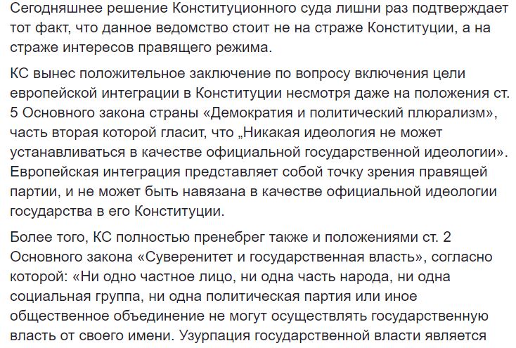 Отметим, что Конституционный суд Молдовы поддержал идею правительства о внесении в Конституцию европейских устремлений страны. Додон, полностью подконтрольный Кремлю, предсказуемо резко раскритиковал эту идею.