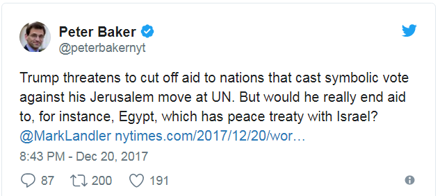 45-й лидер США Дональд Трамп сделал заявление в среду, 20 декабря, что США могут лишить финансовой поддержки государства, которые сегодня, 21 декабря, проголосуют против позиции Америки и поддержат этим резолюцию Совбеза ООН, призывающую Белый дом отменить силу документа о признании Иерусалима главным городом Израиля.