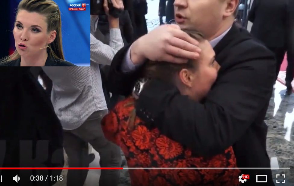 На кадрах видно, как покидающий переговоры Порошенко обнялся на прощание с Лукашенко и направился к выходу, при этом российская журналистка Скабеева попыталась задать ему вопрос о результатах переговоров, но президентская охрана КГБ Белоруси молниеносно пресекла ее попытку довольно оригинальным способом, буквально "обняв" женщину.