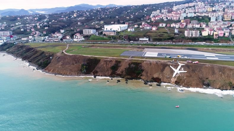 В турецком городе Трабзон пассажирский лайнер Boeing 737 во время приземления выкатился за пределы ВПП и едва не упал в море, застряв на склоне обрыва. Об этом сообщают турецкие информационные агентства, публикуя фотографии и видео с места жуткого происшествия.