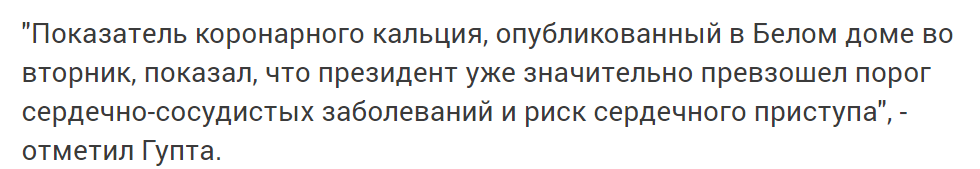 Гупта отметил необходимость повторного медосмотра для Трампа, указав на серьезные риски для его здоровья. Выяснилось, что начиная с 2009 года количество кальция в кровеносных сосудах Трампа значительно увеличилось.
