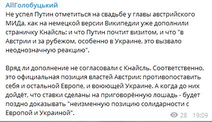 Стоит отметить, что свадьба 53-летней министра Кнайсль состоялась в субботу, 18 августа. Визит на праздник агрессора Путина стал причиной настоящего скандала в мировой общественности, что и зафиксировали в "Википедии". Там, в частности, сообщили, что "в Австрии и за рубежом, особенно в Украине, это (визит агрессора - ред.) вызвало неоднозначную реакцию".