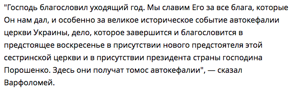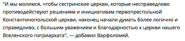Упомянул он и о России, которая отчаянно сопротивлялась и до сих пор ставит палки в колеса украинской автокефалии. Он намекнул РПЦ, что такое неприемлемое поведение будет иметь для нее печальные последствия, посоветовав образумиться. Он посоветовал прекратить свои попытки сорвать получения Украиной Томоса и более уважительно относиться к Константинополю.