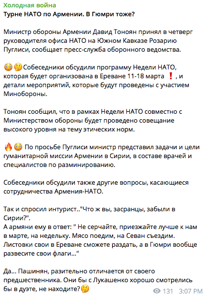 Об укреплении дружбы НАТО и Армении рассказал влиятельный российский telegram-канал "Холодная война", передает "Диалог.UA".