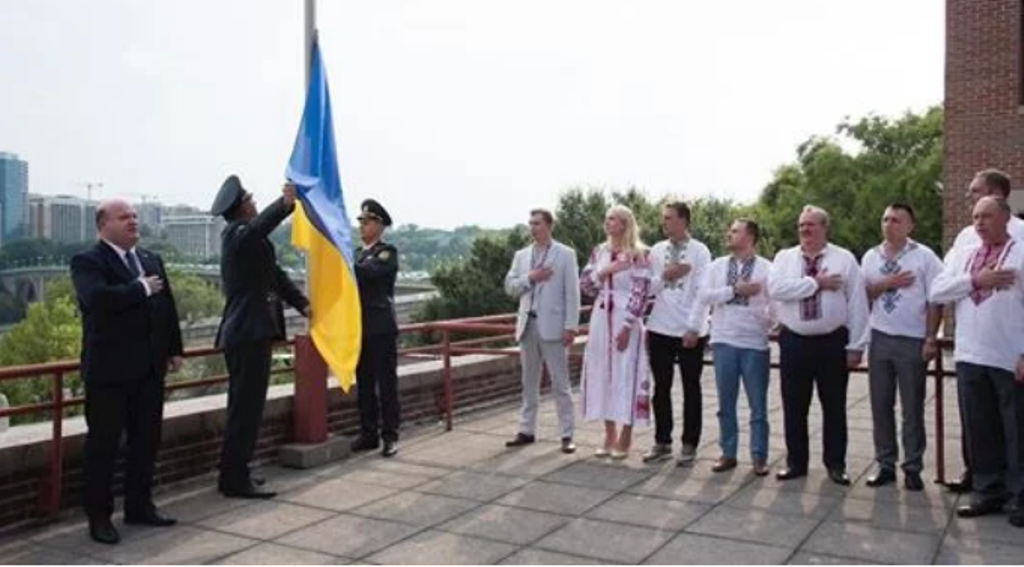 Уточняется, что флаг Украины был поднят на территории Посольства Украины в Вашингтоне в ходе празднования Дня Государственного флага.