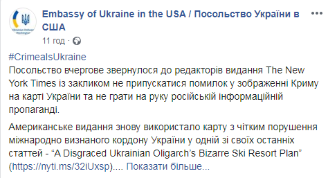 "Посольство в очередной раз обратилось к редакторам издания The New York Times с призывом не допускать ошибок в изображении Крыма на карте Украины и не играть на руку российской информационной пропаганде", - указано в сообщении.