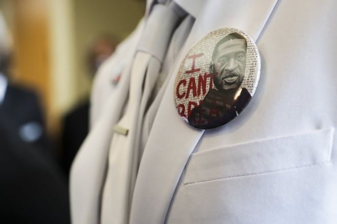 Члены семьи, а также часть гостей оделись на мероприятие в белые одежды, они также надели значки с изображением покойного и его последними словами: "Я не могу дышать".