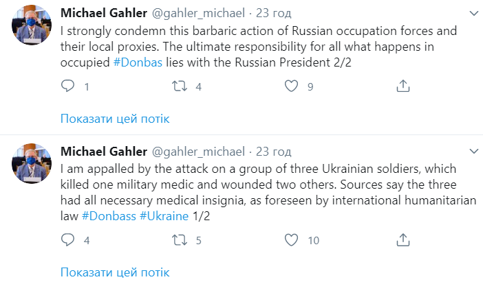 "Я глубоко потрясен и шокирован новостью о нападении на группу из трех украинских солдат, во время которой был убит военный медик и ранены двое других. Решительно осуждаю варварские действия российских оккупационных сил и их союзников на Донбассе. Вся полнота ответственности лежит на президенте России", - говорится в заявлении Галера.