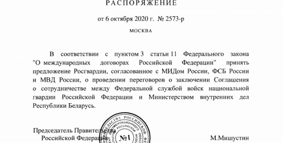 Сегодня на российском правовом портале появилось распоряжение № 2573-р премьер-министра РФ Михаила Мишустина о проведении переговоров между Росгвардией и МВД Беларуси.