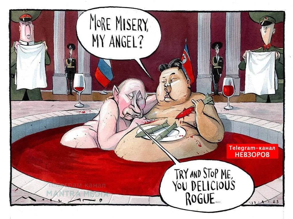 Популярная британская ежедневная газета The Times очень ярко изобразила встречу двух диктаторов Владимира Путин и Ким Чен Ына: эти двое в обнимочку нежатся в большой ванне, наполненной кровью, а в руках держат ракеты, также измазанные кровью. Карикатуру, облетевшую уже весь мировой Интернет, разместил в своем ТГ-канале журналист Александр Невзоров.
