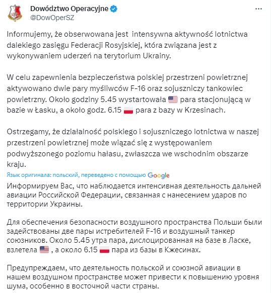 Как передает Оперативное командование ВС Польши, во время атаки на Киев и Харьков баллистическими и крылатыми ракетами в воздушное пространство республики поднялись две пары истребителей F-16 для уничтожения целей, которые потенциально могли залететь на территорию страны, как это было с российской ракетой 29 декабря. Ее ПВО Польши почему-то не стала сбивать.