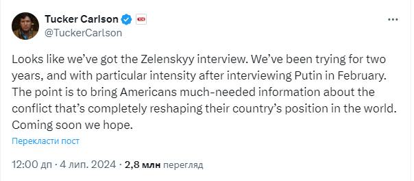 "Уже совсем скоро", – американский журналист Карлсон анонсирует интервью с Зеленским