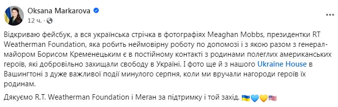 В свою очередь, посол Украины в США Оксана Маркарова подтвердила участие фонда Моббс в поддержке Киева, поблагодарив ее. Дипломат у себя в Facebook опубликовала фото с главой RT Weatherman Foundation, которое было сделано в Украинском доме в Вашингтоне во время чествования семей погибших на войне в Украине американских добровольцев.