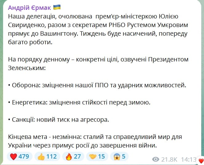 Сегодня в Вашингтон выехала украинская делегация во главе с руководителем Офиса президента Андреем Ермаком, премьер-министром Юлией Свириденко и секретарем СНБО Рустемом Умеровым ( пост Ермака).