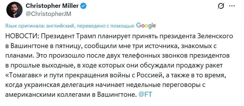 Трамп, который буквально сегодня объявил о прекращении войны между Израилем и Палестиной, теперь, по словам аналитиков, "переходит к следующему глобальному кризису" - российско-украинской войне. Как отмечает Financial Times, предметом переговоров могут стать поставки Украине крылатых ракет "Томагавк", о чем уже активно говорят в дипломатических кругах. Если это произойдет, Киев впервые получит дальнобойное американское оружие, способное радикально изменить баланс сил ударами в глубокий тыл РФ.