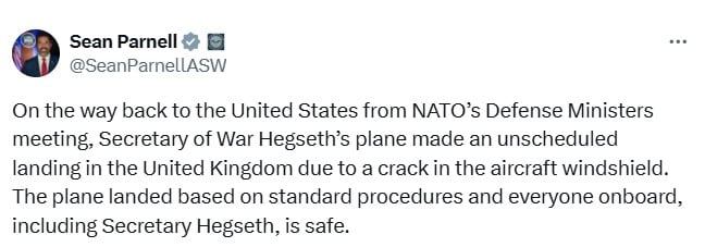Позже помощник главы Пентагона по связям с общественностью Шон Парнелл раскрыл подробности случившегося. Он заявил, что самолет с Хегсетом совершил внеплановую посадку из-за трещины в ветровом стекле.