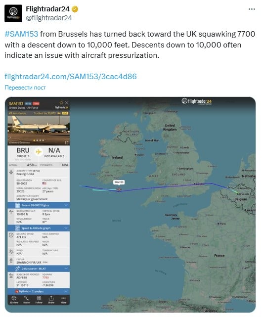 Над Атлантикой самолет передал код 7700 – международный сигнал чрезвычайной ситуации, после чего развернулся и направился обратно в сторону Европы.