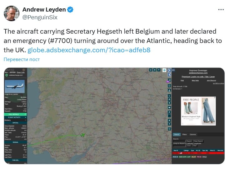 Самолет министра обороны США Пита Хегсета экстренно развернулся над Атлантическим океаном после сигнала с кодом 7700.