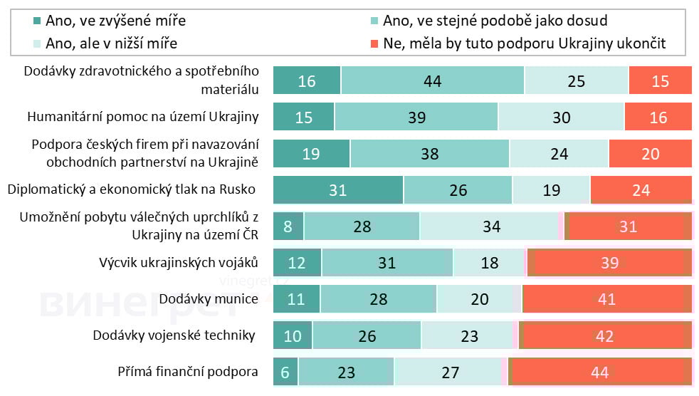 Опрос, проведенный с 4 по 8 октября среди 1502 совершеннолетних граждан Чехии, показал, что наибольшее одобрение населения вызывает поставка Украине медицинских и расходных материалов. За сохранение этой поддержки в нынешнем объеме высказались 44% респондентов, еще 16% хотели бы увеличить объемы. При этом четверть опрошенных считает, что помощь стоит сократить, а 15% — прекратить полностью.