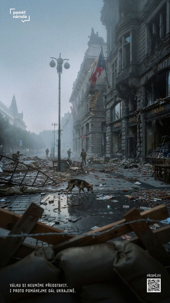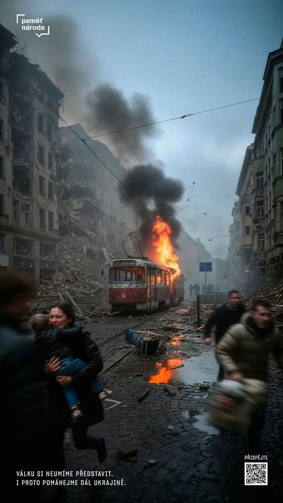 Проект Paměť národa использовала сгенерированные ИИ изображения разрушенных улиц, на которых местами отображены военные и бронетехника, напоминающие архивные кадры Второй мировой войны.