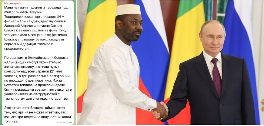 Потеря Мали станет серьезным ударом по позициям России в Африке, где Кремль строил сеть военных и политических союзов через ЧВК "Вагнер" и поставки оружия. Террористическая организация JNIM — филиал "Аль-Каиды", действующий в Сахеле — уже месяц удерживает столицу Мали в блокаде, сообщают российские военные Telegram-каналы.