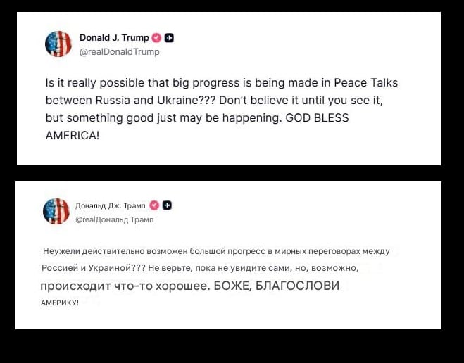 Президент США Дональд Трамп написал в соцсетях, что в переговорах о мире между Россией и Украиной, "возможно, происходит что-то хорошее". Он подчеркнул, что прогресс может быть реальным, но призвал "не верить, пока не увидите".