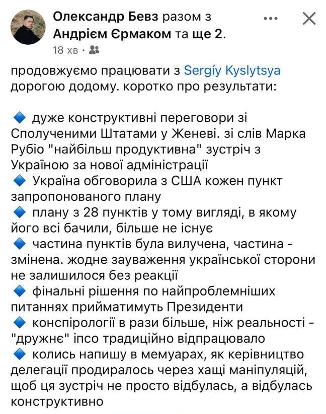 "Часть пунктов была удалена, часть изменена. Конспирологии было в разы больше, чем реальности", — написал Бевз, добавив, что делегации пришлось "продраться через джунгли манипуляций", чтобы переговоры были конструктивными.