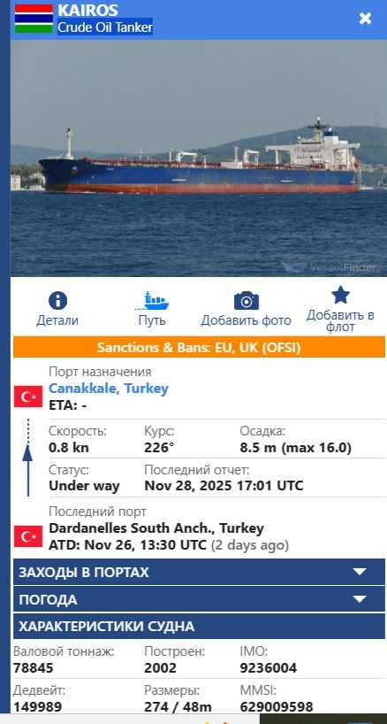Как сообщает "Русская служба BBC", речь идет о судне Kairos, шедшем под флагом Гамбии. Этот танкер находится под санкциями Евросоюза, Великобритании и Швейцарии.