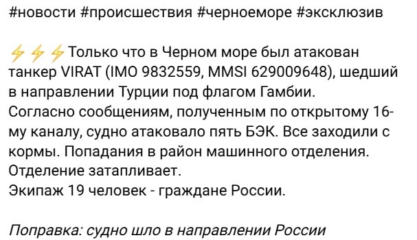 Между тем некоторые российские каналы уже пишут о "целенаправленной" атаке на танкер. Они утверждают, что судно якобы было атаковано пятью безэкипажными катерами.