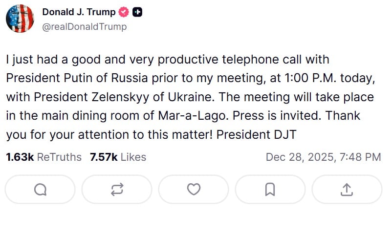 Лидер США Дональд Трамп перед предстоящей сегодня встречей с украинским коллегой Владимиром Зеленским во Флориде провел телефонный разговор с российским диктатором Владимиром Путиным.