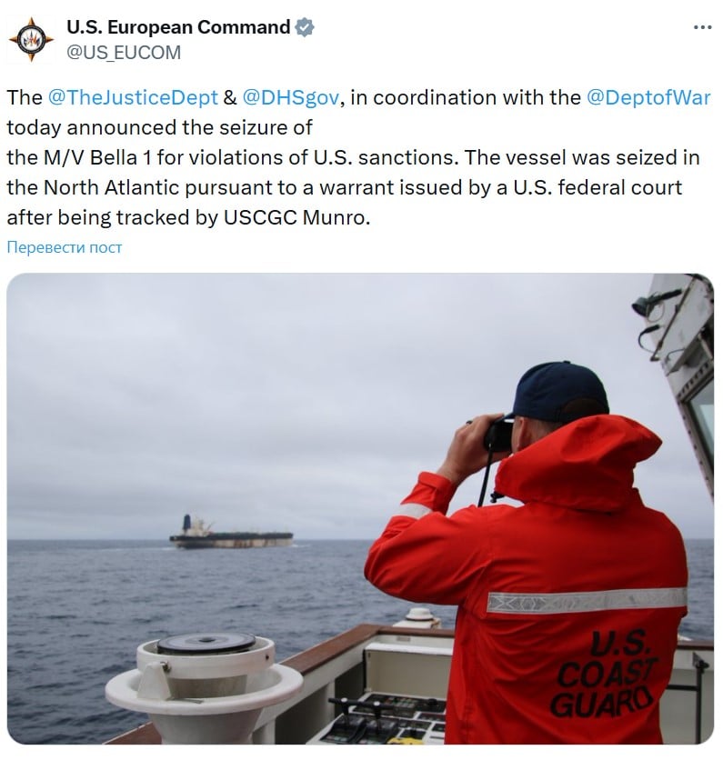 В американской армии выступили с официальным заявлением относительно операции по захвату связанного с Венесуэлой танкера Marinera (ранее судно носило название Bella 1), шедшего под флагом РФ.