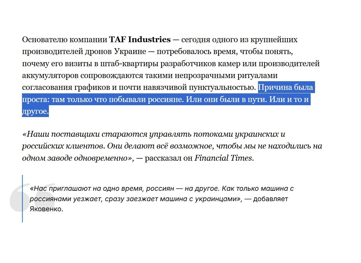 "Мы видим новый модуль на российском дроне и сразу понимаем, с какого завода он. Пишем туда — и через время нам отвечают: “Хорошо, можем продать и вам"", — говорит он.