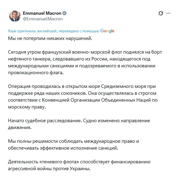По словам Макрона, операция проводилась при поддержке союзников и в полном соответствии с Конвенцией ООН по морскому праву. Танкер шел под ложным флагом и, как предполагается, входил в так называемый "теневой флот" России — сеть судов, с помощью которых Кремль пытается обходить санкции и продолжать экспорт нефти.