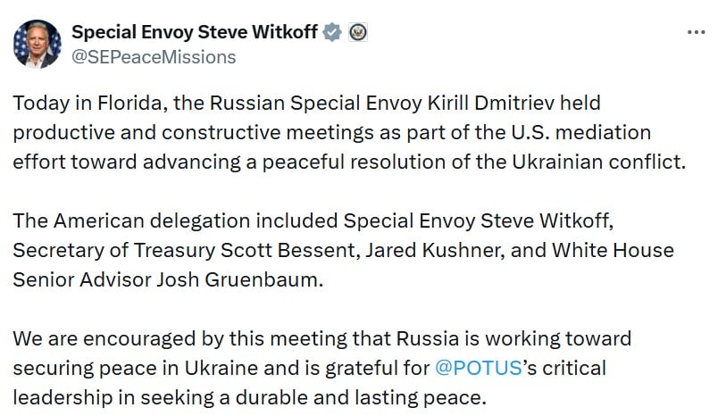 "Мы воодушевлены этой встречей, которая показывает, что Россия работает над обеспечением мира в Украине", – написал спецпредставитель президента США.
