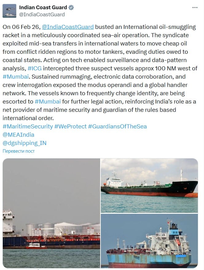 Как сообщили в Силах береговой охраны страны на своей страннице в соцсети X, 6 февраля у побережья Мумбаи были задержаны три нефтяных танкера, подозреваемых в контрабанде. В операции участвовали военно-морские силы и военно-воздушные силы страны.