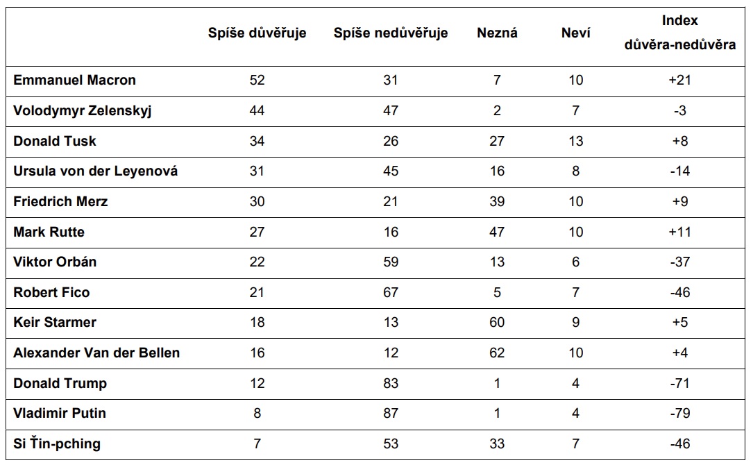 Центр изучения общественного мнения Чехии (CVVM), который является исследовательским подразделением Института социологии Академии наук Чешской Республики, опубликовал новые данные о доверии граждан к зарубежным политикам. Исследование проводилось с 23 января по 2 февраля 2026 года среди 1725 респондентов старше 15 лет, передает ресурс "Винегрет".