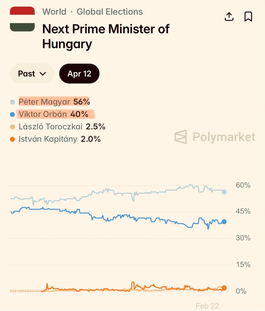 По оценкам Polymarket, вероятность того, что следующим премьер-министром станет Петер Мадьяр, составляет около 56%, тогда как шансы Орбана оцениваются примерно в 40%. Эти цифры отражают растущую неопределённость вокруг будущего нынешнего венгерского руководства.