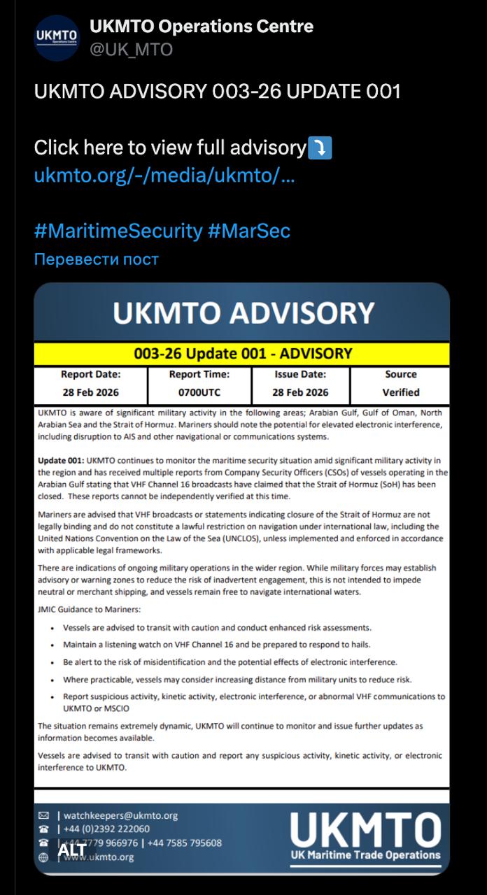 Британское агентство морских торговых операций также получает многочисленные сообщения о перекрытии Ормузского пролива от капитанов кораблей.