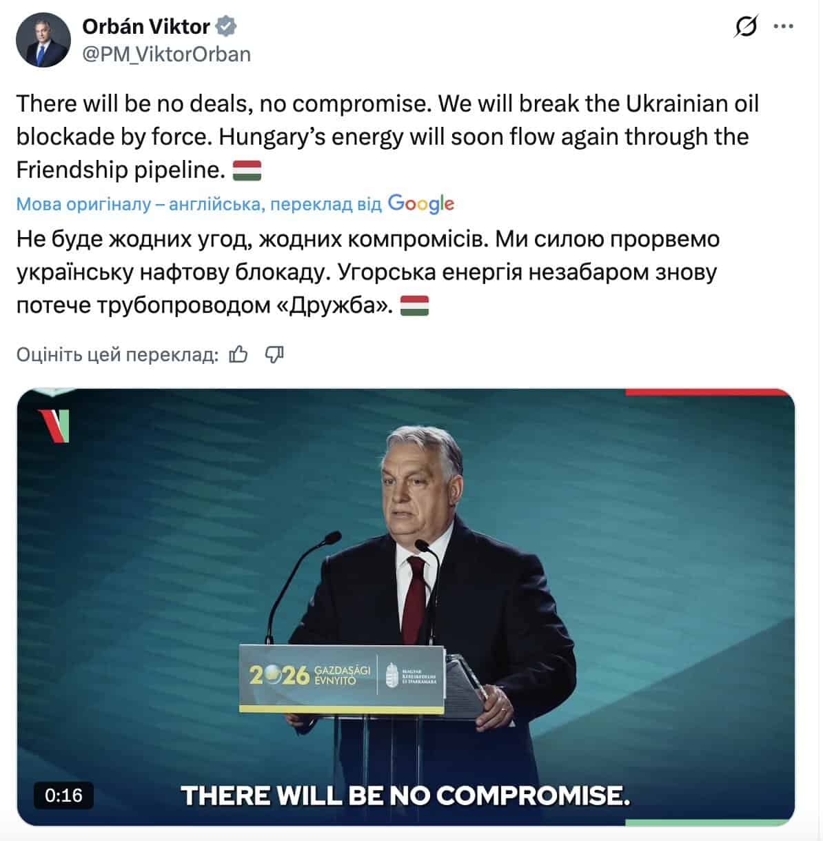 "Не будет никаких соглашений, никаких компромиссов. Мы силой прорвем украинскую нефтяную блокаду", - заявил Орбан.