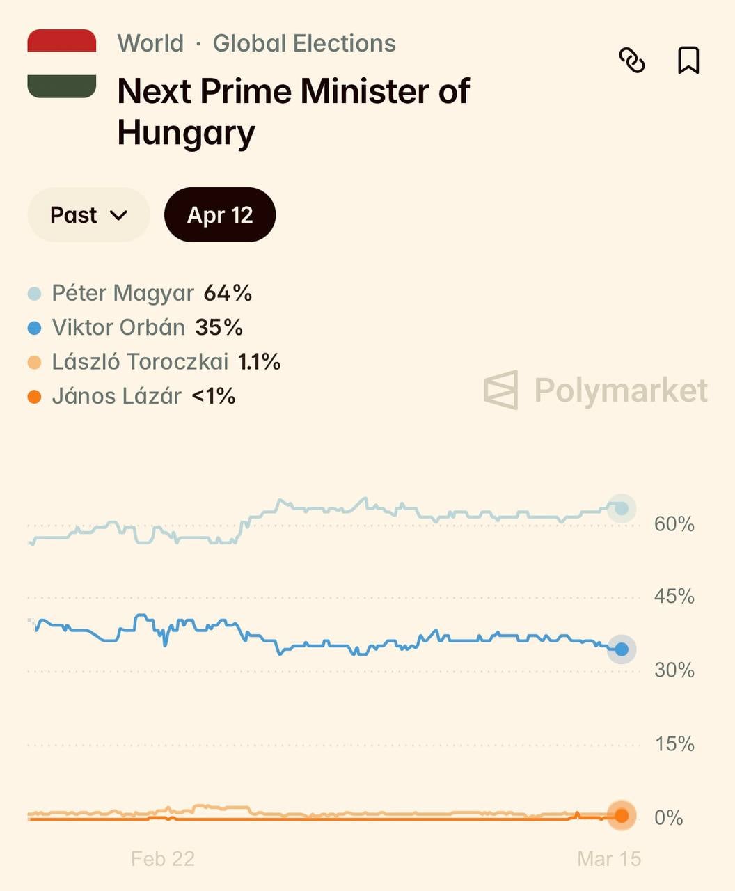 Ставочный рынок Polymarket, который агрегирует ожидания участников рынка, также показывает преимущество Мадяра. По данным платформы, вероятность того, что он станет следующим премьер-министром Венгрии, оценивается примерно в 64%, тогда как у Орбана около 35%.
