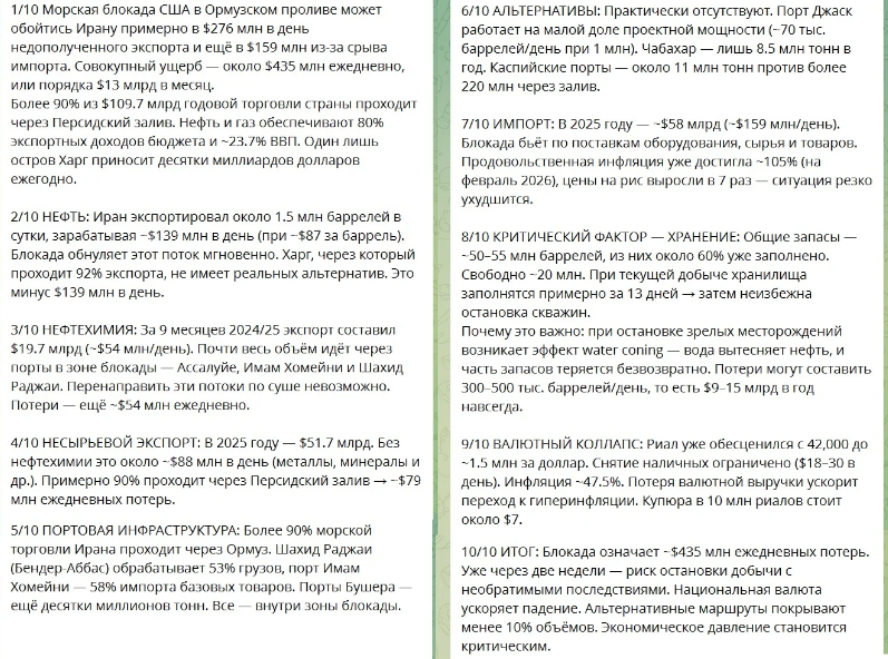 Блокада означает $435 млн ежедневных потерь для Ирана. Уже через две недели будет риск остановки добычи с необратимыми последствиями. Экономическое давление становится критическим.