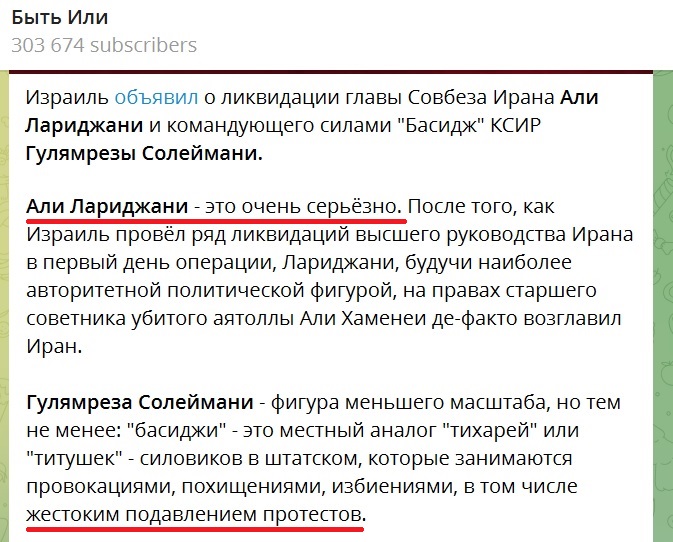 Reuters сначала сообщал, что после удара судьба Лариджани оставалась неясной, однако позже Израиль официально заявил о его ликвидации. Подтверждения со стороны Тегерана пока нет, поэтому информация остается основанной на заявлениях израильских властей.
