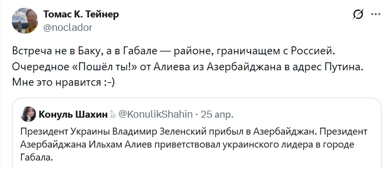 Азербайджан российское давление проигнорировал. 25 апреля Зеленский все же прилетел в Габалу и провел переговоры с президентом Алиевым. Баку фактически публично дистанцировался от позиции Москвы в момент, когда дипломатическая активность вокруг войны достигает максимума.