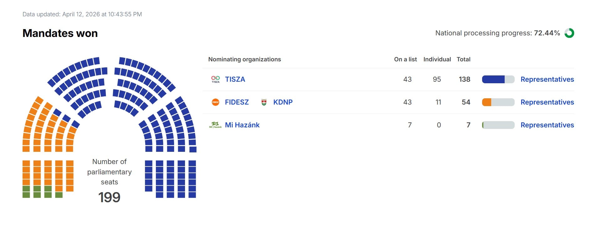 После обработки 77,45% бюллетеней "Тиса" берет более 2/3 мест в парламенте – 138 мандатов.