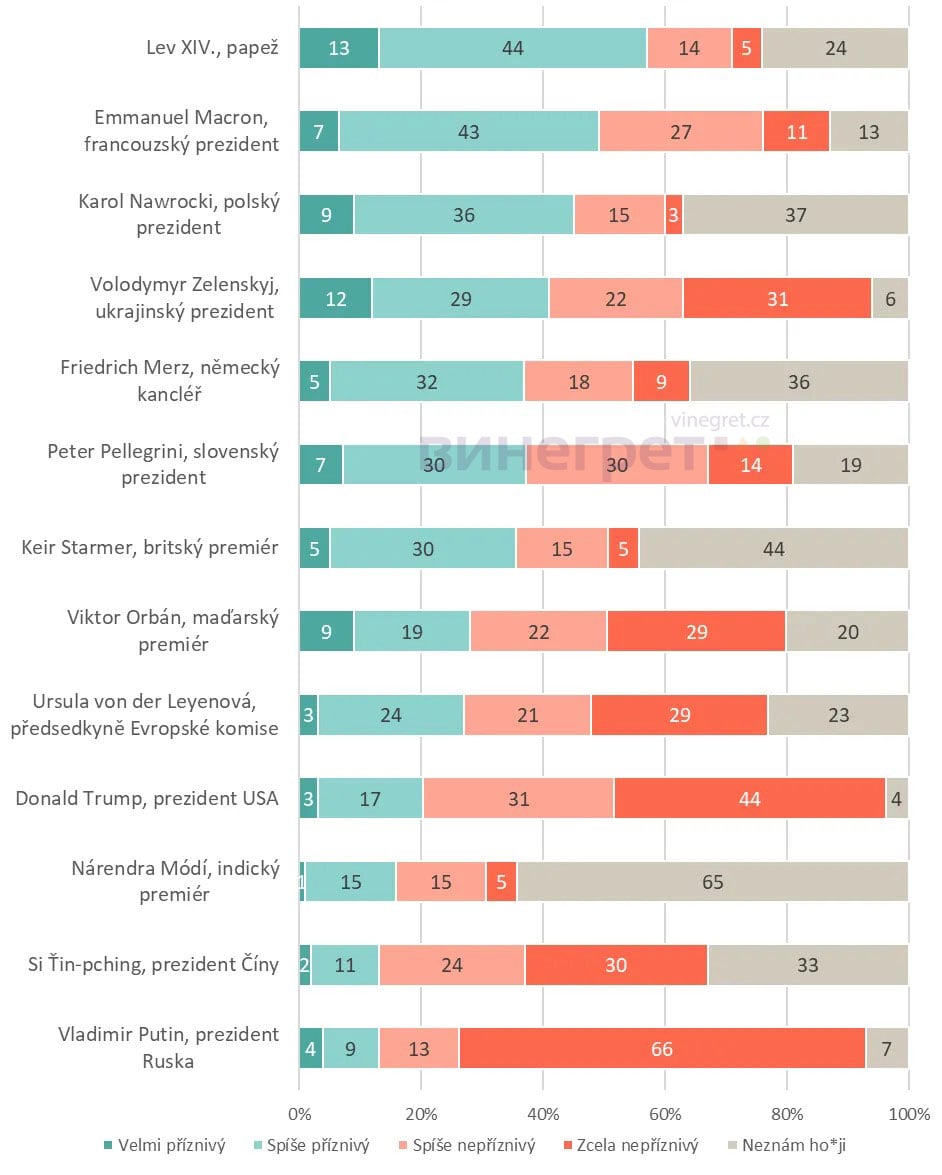 Согласно опросу STEM, 57% чехов положительно относятся к Папе Льву XIV, 41% – к Зеленскому, а Путин и Си Цзиньпин набрали лишь по 13%.