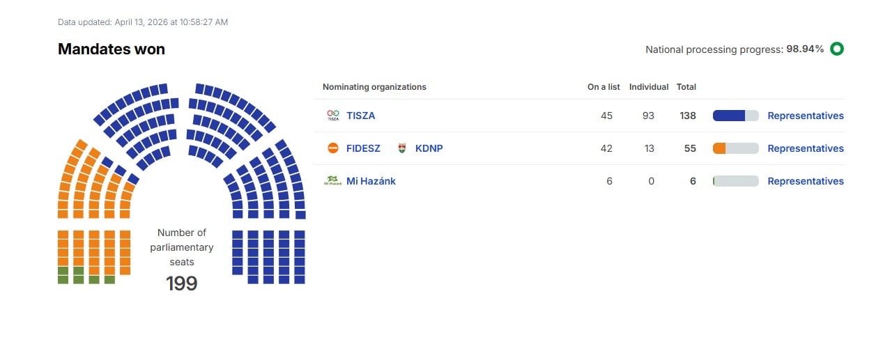 По данным Национального избирательного бюро Венгрии, после обработки 98% бюллетеней партия "Тиса" во главе с Петером Мадьяром получает 138 мест из 199 в парламенте. Это более двух третей мандатов, что обеспечивает конституционное большинство. За оппозицию проголосовали 3,3 миллиона избирателей, а явка составила рекордные 77,8%. Правящая партия Виктора Орбана "Фидес" вместе с христианскими демократами набрала лишь 55 кресел, а ультраправая "Наша Родина" 6 мест.
