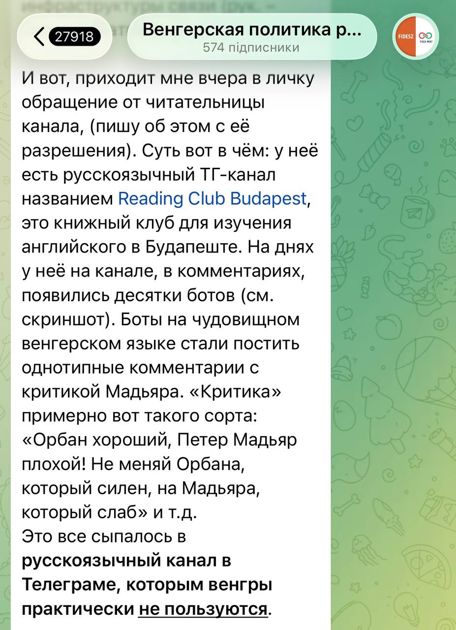 Также сообщается, что боты оставляют такие сообщения в одном из русскоязычных Trelegram-каналов, который практически не читается жителями Венгрии.